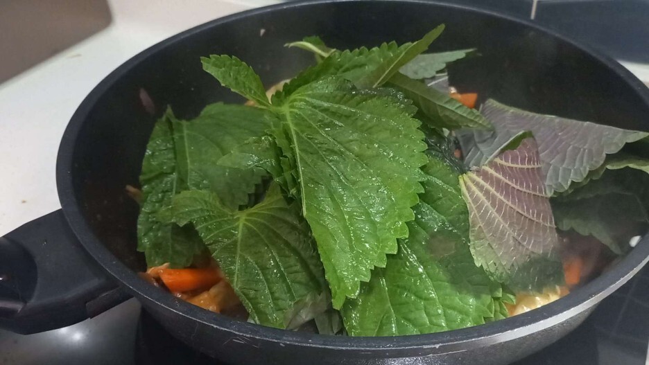열심히 볶다가 딱딱했던 순대가 말랑해지기 시작하면 깻잎을 마지막으로 넣고 볶는다.